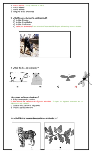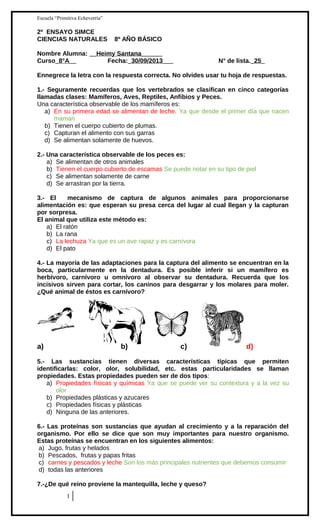 Este documento contiene las preguntas y respuestas correctas de un examen de Ciencias Naturales para estudiantes de 8o año básico. El examen incluye 15 preguntas sobre temas como la clasificación de vertebrados, características de mamíferos, peces, y aves, mecanismos de captura de alimento en animales, propiedades de sustancias, nutrientes en alimentos, reinos biológicos, cambios químicos, el trabajo de Luis Pasteur, métodos asépticos en medicina, y factores que
