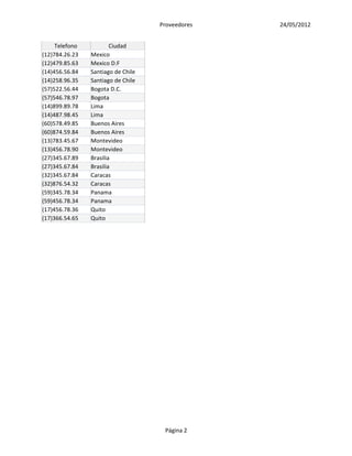Este documento lista 20 proveedores con su código de identificación, nombre, dirección, teléfono y ciudad. Los proveedores se encuentran en varios países de América Latina como México, Colombia, Chile, Perú, Argentina, Uruguay, Brasil, Venezuela, Panamá y Ecuador.