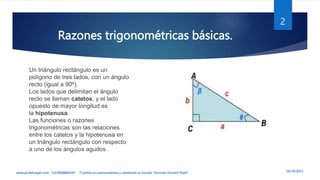 Este documento resume las razones trigonométricas básicas. Explica que el seno, coseno y tangente de un ángulo agudo se definen como las relaciones entre los catetos y la hipotenusa de un triángulo rectángulo. Proporciona fórmulas para calcular el seno, coseno y tangente en términos de los lados del triángulo. Además, incluye un ejemplo numérico para ilustrar el cálculo de estas razones trigonométricas.