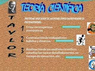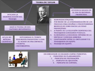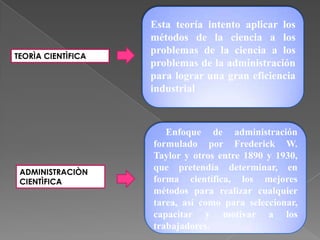Este documento resume varias teorías clásicas y contemporáneas de la administración. Presenta la Teoría de la Administración Científica de Taylor, que aplica métodos científicos a problemas administrativos para lograr eficiencia industrial. También describe la Teoría de la Gerencia Administrativa de Fayol y Weber, que establece principios para crear sistemas eficientes de administración, como la burocracia. Además, examina teorías más recientes como la Administración Cuantitativa, la Administración de Operaciones, y