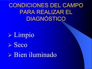 Este documento describe los diferentes métodos de diagnóstico de caries dental, incluyendo la inspección visual directa e indirecta, métodos colorimétricos, radiografías y métodos eléctricos. Explica cómo clasificar las lesiones de caries según su ubicación y tamaño, así como distinguir caries de otras patologías como fluorosis, hipoplasia y abrasión. Además, detalla los enfoques para evaluar la salud pulpar y diferenciar entre etiologías de lesiones que afectan el ángulo incisivo.