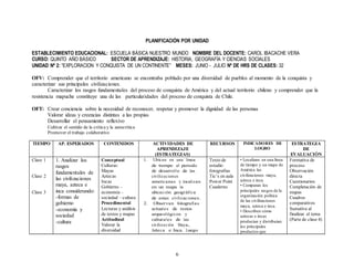 Este documento presenta la planificación de una unidad didáctica sobre la exploración y conquista de América para un curso de quinto año básico. La unidad abarca 16 clases y busca que los estudiantes comprendan las civilizaciones precolombinas, el proceso de conquista del continente y sus efectos en los pueblos indígenas. Se utilizarán diversas estrategias como análisis de textos, mapas y líneas de tiempo.