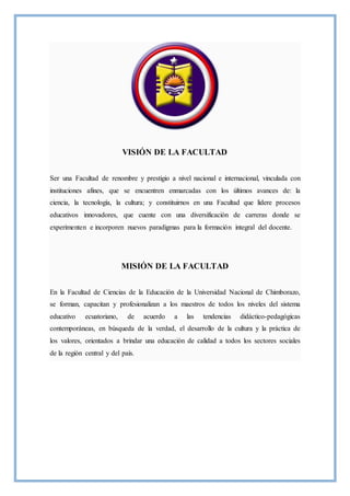La Facultad de Ciencias de la Educación de la Universidad Nacional de Chimborazo tiene como visión ser reconocida a nivel nacional e internacional por sus innovadores procesos educativos y diversificación de carreras basadas en los últimos avances científicos y tecnológicos. Su misión es formar, capacitar y profesionalizar a maestros de todos los niveles del sistema educativo ecuatoriano de acuerdo a tendencias didácticas contemporáneas para brindar una educación de calidad a todos los sectores sociales.