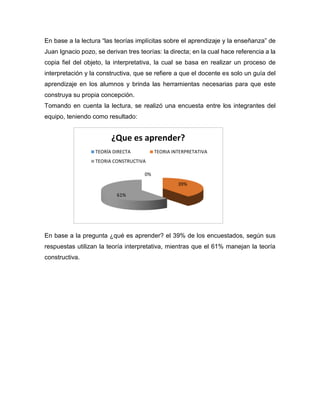 Este documento presenta los resultados de una encuesta realizada entre estudiantes sobre sus perspectivas acerca del aprendizaje. La encuesta se basó en tres teorías del aprendizaje descritas en un artículo: la teoría directa, la interpretativa y la constructiva. Los resultados mostraron que la mayoría de los estudiantes adoptan una perspectiva constructivista del aprendizaje, viendo al maestro como guía y considerando que el aprendizaje implica la construcción activa del conocimiento por parte del estudiante.