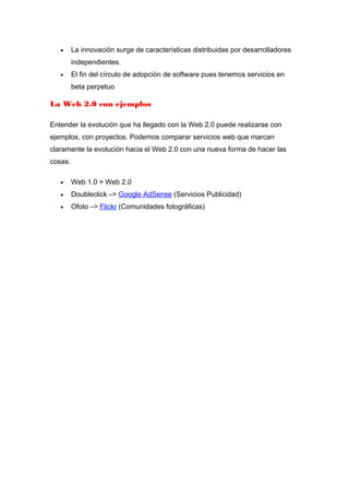 La Web 2.0 se refiere a la transición de aplicaciones tradicionales de escritorio a aplicaciones en línea centradas en el usuario que fomentan la colaboración. Representa una evolución del Internet estático original a uno más dinámico e interactivo, impulsado por principios como plataformas en línea, información compartida, participación distribuida e innovación descentralizada. Se originó en 2004 con la primera conferencia Web 2.0 en San Francisco.