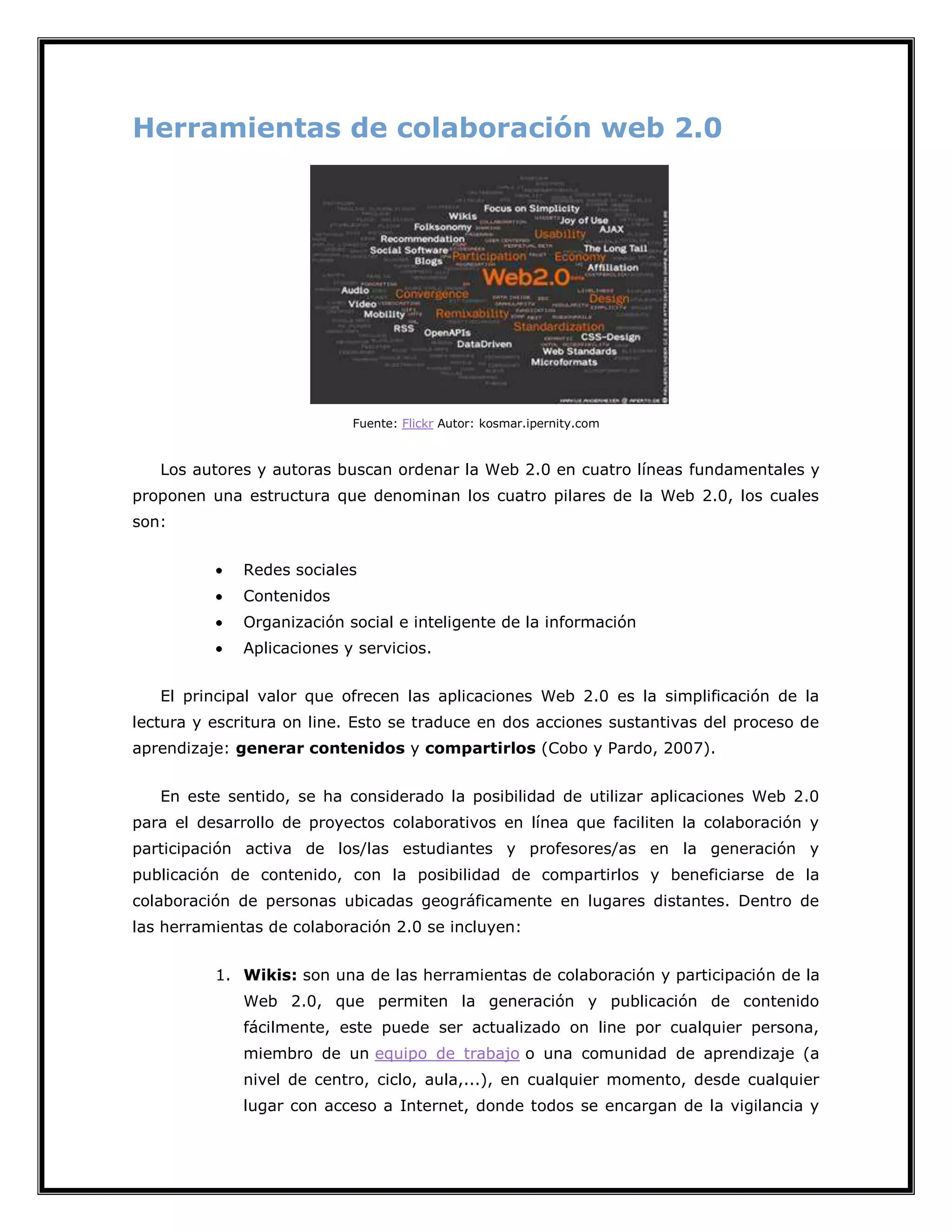 El documento describe cuatro pilares fundamentales de la Web 2.0: redes sociales, contenidos, organización social e inteligente de la información, y aplicaciones y servicios. Explica que las herramientas Web 2.0 facilitan la generación y compartición de contenidos entre estudiantes y profesores de forma colaborativa. Entre estas herramientas se mencionan wikis y blogs, que permiten actualizar y publicar contenido de forma colaborativa desde cualquier lugar.