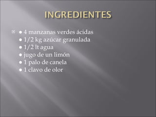 Este documento proporciona instrucciones para preparar mermelada de manzana casera. Incluye los ingredientes necesarios como 4 manzanas verdes ácidas, 1/2 kg de azúcar granulada, 1/2 litro de agua, jugo de limón y especias como canela y clavo. Las instrucciones detallan cómo lavar, pelar y cortar las manzanas y hervir los ingredientes hasta que la fruta esté tierna. Luego se enfría y envasa la mermelada en frascos esterilizados para su conservación.