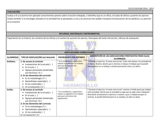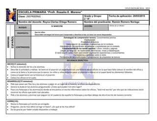 Este documento presenta la lección sobre oficios impartida a un grupo de 2o grado. La lección tuvo como objetivo que los estudiantes desarrollaran estrategias de lectura para comprender un texto con versos sobre oficios. La maestra utilizó actividades interactivas como colocar nombres de oficios en un papel y corregir un texto mal escrito. El documento también incluye detalles sobre dos estudiantes que requieren adecuaciones y la evaluación de comprensión aplicada.