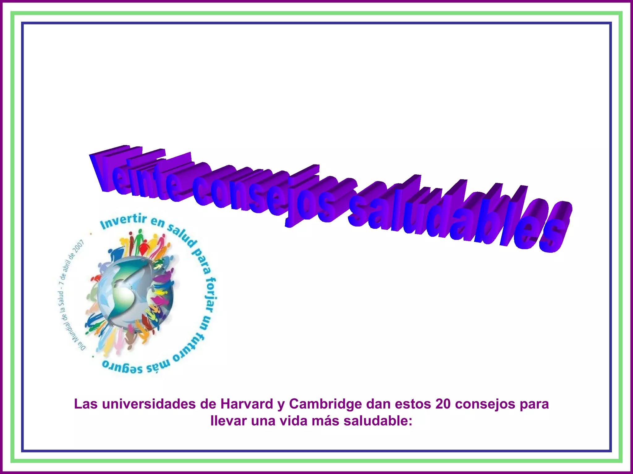 Este documento proporciona 20 consejos para llevar una vida más saludable de acuerdo a las universidades de Harvard y Cambridge. Algunos de los consejos incluyen comer una naranja al día para aumentar el hierro en el cuerpo, espolvorear canela en el café para mantener bajo el colesterol, comer pan integral en lugar de blanco, masticar los vegetales más tiempo, adoptar la regla del 80% para dejar comida en el plato, y reírse para reducir el estrés.
