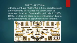 El documento resume la historia de Egipto desde el período predinástico hasta la dominación romana, dividiéndola en tres imperios principales (Antiguo, Medio y Nuevo) con periodos intermedios. Destaca que la cultura egipcia se caracterizó por su arte monumental, su escritura jeroglífica y su concepción religiosa de la inmortalidad del faraón.