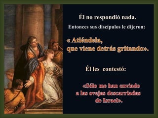 El documento resume la historia bíblica de Jesús retirándose a Tiro y Sidón y encontrándose con una mujer cananea que le pide ayuda para su hija poseída. Aunque Jesús no responde al principio, finalmente la ayuda después de que la mujer manifiesta una gran fe. El documento también reflexiona sobre la importancia del diálogo y la oración entre Jesús y la mujer, y cómo este evento muestra que la fe no conoce fronteras sociales.