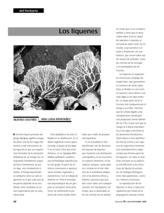 Los líquenes son organismos formados por la asociación simbiótica entre un hongo y un organismo fotobióntico como algas o cianobacterias. Se han identificado más de 17,000 especies de líquenes que muestran una distribución cosmopolita y crecen en diversos hábitats. Los líquenes cumplen funciones importantes como la degradación de rocas y formación de suelos, fijación de nitrógeno atmosférico, y sirven como alimento y refugio para otros organismos.