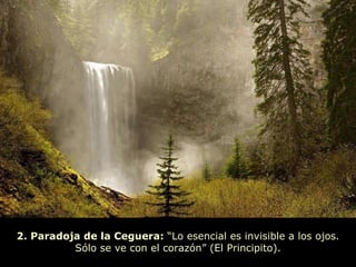 Este documento presenta 20 famosas paradojas agrupadas en temáticas como la lógica, la tecnología, el tiempo, la felicidad, el conocimiento y más. Algunas de las paradojas mencionadas son la paradoja de los sentimientos contra la razón, la paradoja de la ceguera que dice que sólo se ve con el corazón, y la paradoja de la tecnología que acerca a unos pero aleja a otros.
