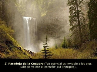 El documento presenta una serie de 20 paradojas célebres que exploran conceptos sobre sentimientos, lógica, cultura, tecnología y felicidad, entre otros. Cada paradoja destaca contradicciones inherentes a la experiencia humana, como la relación entre el conocimiento y la humildad, así como el contraste entre la riqueza material y la verdadera riqueza. Estas paradojas invitan a la reflexión sobre la naturaleza de nuestras percepciones y experiencias en la vida cotidiana.