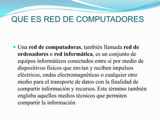 El documento describe varios conceptos clave relacionados con las redes de computadoras. Define una red de computadoras, redes LAN y WAN, la topología de redes, el modelo cliente-servidor, e Internet. También explica elementos de hardware y software, proveedores de Internet y el protocolo IP.
