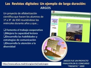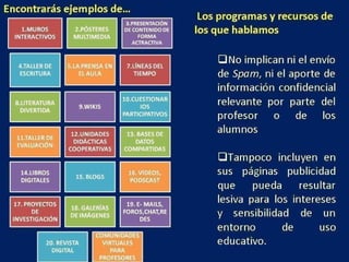 El documento lista diferentes herramientas digitales como Micropelículas, Go-Animate, ImageChef y Voki que pueden usarse para crear historias animadas, poemas visuales, puntuación y entonación. También menciona una videoteca con más de 250 videos de naturaleza creados por estudiantes y cómo las plataformas de aprendizaje permiten elaborar propuestas cooperativas con información y apoyo audiovisual equilibrado.