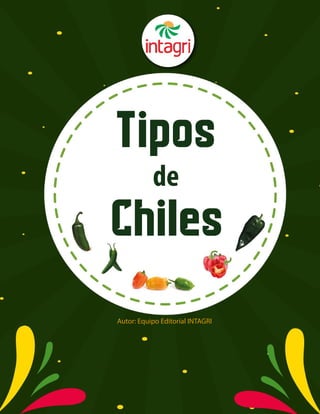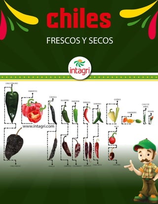Este documento describe los principales tipos de chiles cultivados en México, incluyendo el chile jalapeño, serrano, poblano, habanero y pimiento morrón. México posee una amplia diversidad de chiles que varían en forma, sabor, picor y uso culinario. Los chiles jalapeño, serrano y habanero son conocidos por su alto nivel de picante, mientras que el poblano y pimiento morrón son opciones menos picantes. Cada tipo de chile tiene características distintivas de la planta, flor y fr