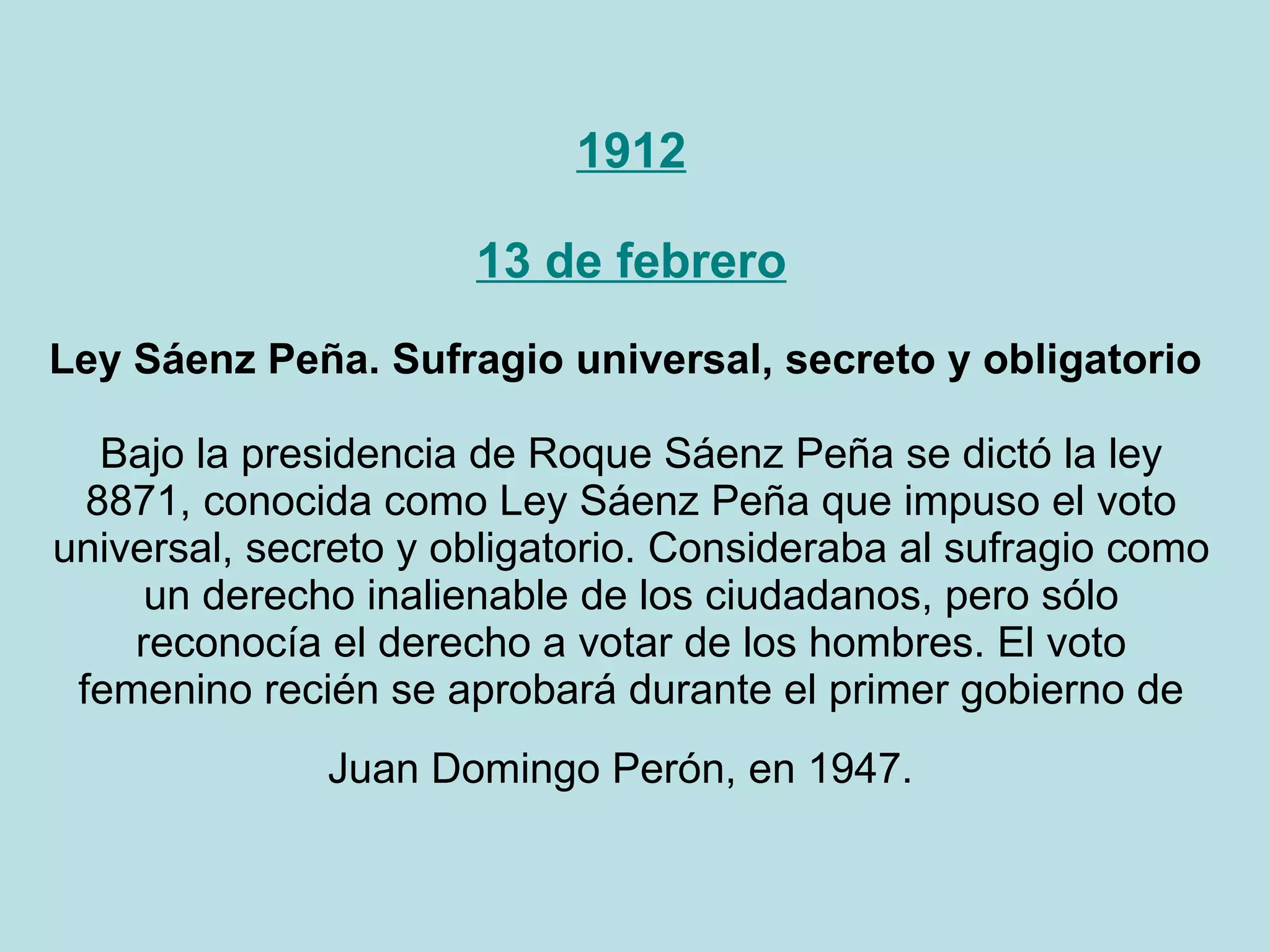 La ley Sáenz Peña de 1912 estableció el sufragio universal, secreto y obligatorio para los hombres en Argentina. En 1913 se inauguró la primera línea del subterráneo de Buenos Aires. En 1916 asumió la presidencia Hipólito Yrigoyen de la Unión Cívica Radical tras las primeras elecciones con voto secreto.