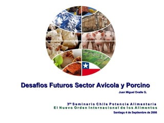 El documento analiza las tendencias y desafíos del sector avícola y porcino a nivel internacional y nacional. A nivel internacional, destaca el crecimiento del consumo de carne en países como China e India. También señala la integración y concentración del sector, así como la internacionalización de las empresas. A nivel nacional, resalta que Chile representa solo el 0,66% de la producción mundial avícola y porcina, y que las exportaciones de productos elaborados son una oportunidad de crecimiento. Concluye que es cl