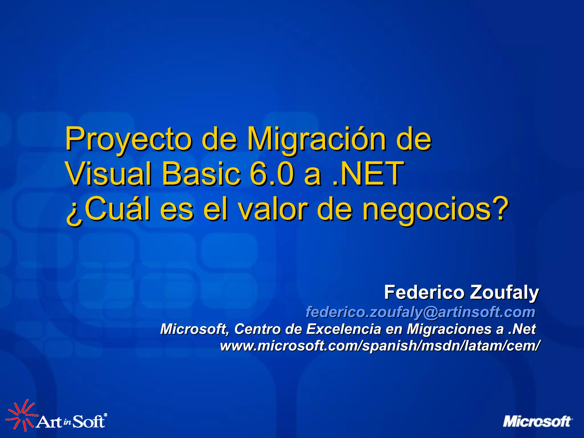 Este documento discute las razones para considerar una migración de aplicaciones Visual Basic 6.0 a .NET. Explica que la migración puede reducir costos operativos y permitir aprovechar nuevas tecnologías. También describe herramientas como el Visual Basic 6.0 to Visual Basic .NET Upgrade Wizard que facilitan la migración automática de código para lograr equivalencia funcional. Finalmente, enfatiza la importancia de evaluar factores como el valor de negocio y la calidad del código antes de tomar la decisión de migrar.