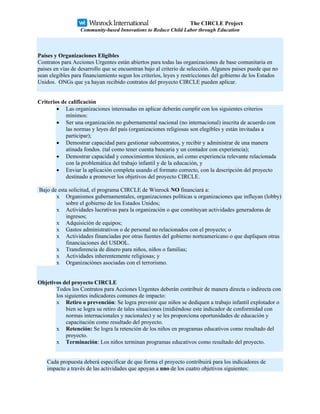 Este documento es una solicitud de propuestas para proyectos innovadores de corto plazo que promuevan oportunidades educativas para niños en riesgo de trabajo infantil o que ya están involucrados en él. Busca financiar proyectos comunitarios de $3,000 a $5,000 en países en desarrollo para abordar este problema. Los proyectos deben apoyar la educación, prevenir el trabajo infantil, y retirar a niños de situaciones de explotación laboral a través de enfoques innovadores y urgentes a nivel local.