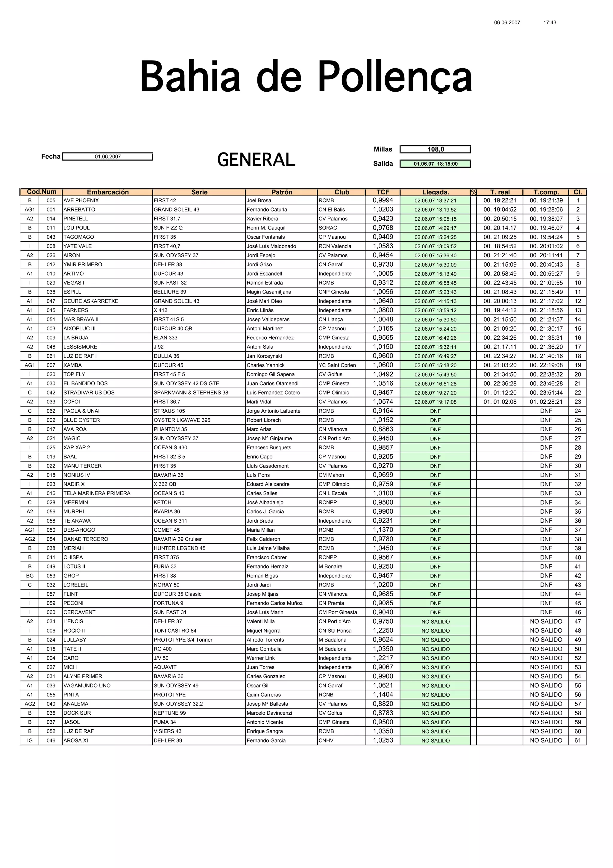 This document summarizes the results of a sailing race that took place on June 1st and 2nd, 2007 in Mallorca, Spain. It lists 62 boats that participated, including their identification number, type of boat, captain, home club, rating, start time, finish time, and place of finish. Some boats did not finish the race or did not start at all. The boats that finished ranged in size from 31 to 50 feet and represented clubs from Spain and France.