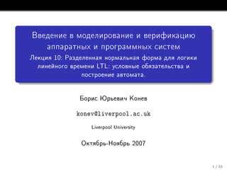 El documento describe la lógica temporal LTL (Lógica Temporal Lineal) y cómo convertir fórmulas LTL a forma normal disyuntiva simplificada (DSNF). Explica los operadores LTL como F, G, U, W y cómo negarlos. Luego detalla el proceso de conversión de una fórmula LTL a una fórmula equivalente en DSNF mediante la introducción de proposiciones auxiliares.