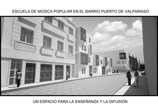 El documento propone la creación de una Escuela de Música Popular en el barrio Puerto de Valparaíso. Se ubicaría en un terreno en la calle Bustamante, en el antiguo ascensor Arrayán, para conectar el cerro con el plan y crear una plaza pública dedicada a la música popular porteña. El proyecto consiste en una fragmentación volumétrica y programática con salas individuales y grupales, servicios complementarios como biblioteca y cafetería, y una sala de conciertos, para fomentar la enseñanza y