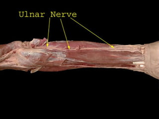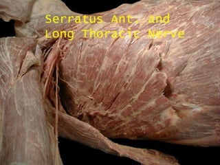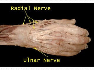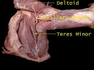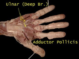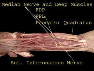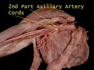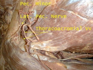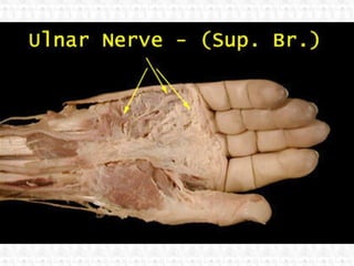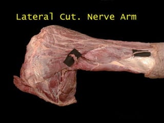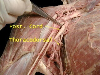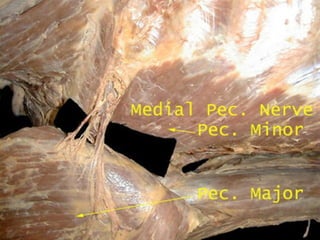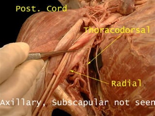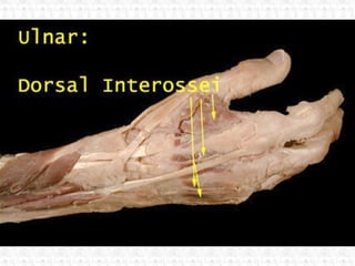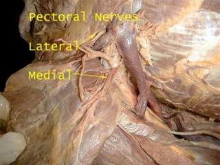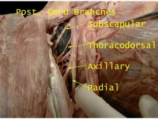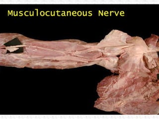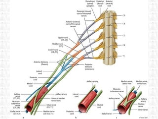 El documento describe la inervación del miembro superior, incluyendo la formación del plexo braquial a partir de las raíces espinales y sus divisiones en cordones y fascículos, así como los principales nervios que inervan los músculos y la piel del hombro y brazo.