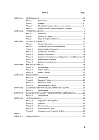 Este documento presenta la Norma Técnica E.030 sobre el diseño sismorresistente de edificaciones. Establece los requisitos para que las edificaciones tengan un comportamiento adecuado ante sismos. Incluye capítulos sobre parámetros de sitio, requisitos generales, análisis de edificios, cimientos, elementos no estructurales y evaluación/reforzamiento de estructuras. Define la zonificación sísmica del país, tipos de suelos, y parámetros para el cálculo de la fuerza sísm