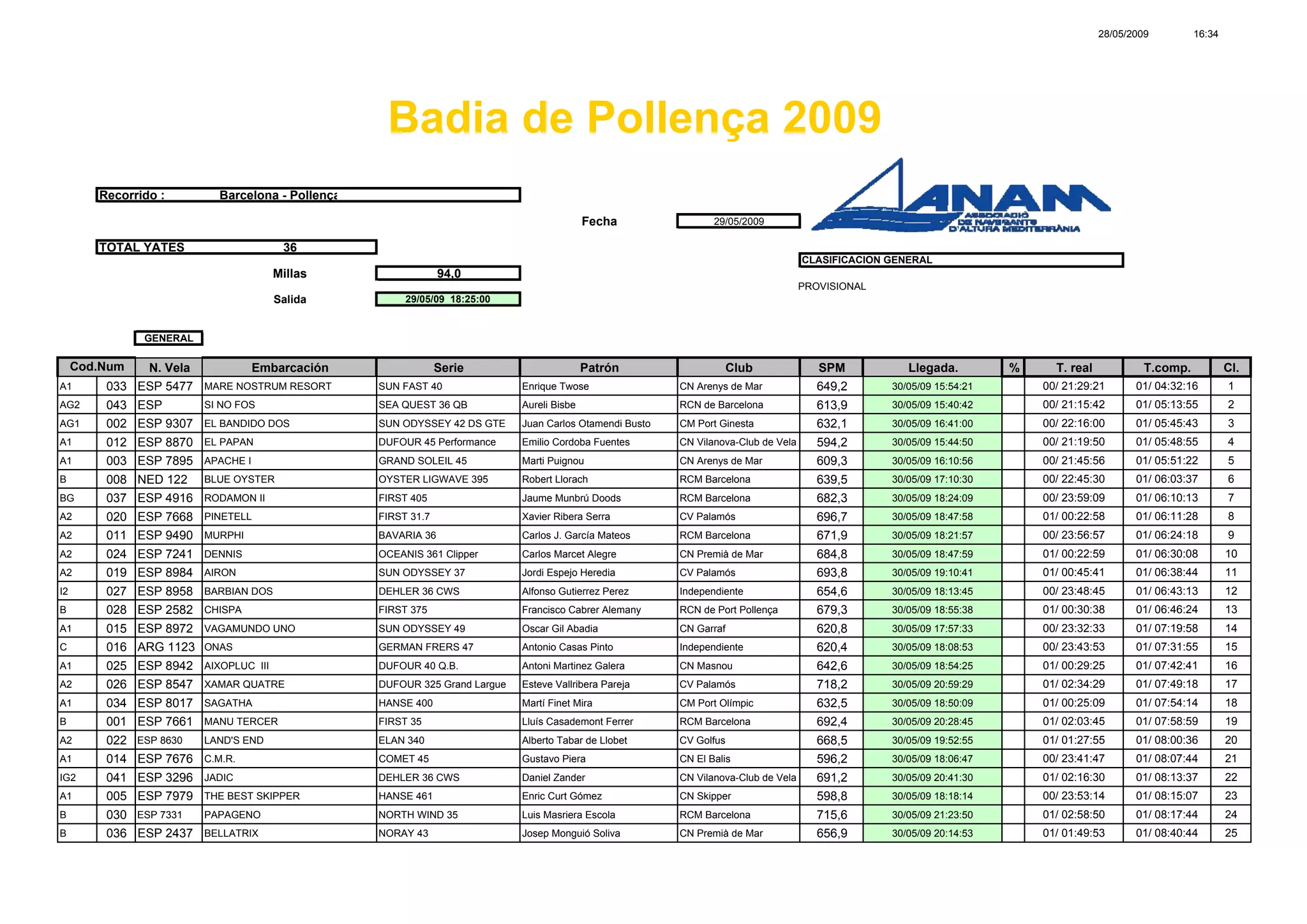 Barcelona - Pollença Fecha 29/05/2009 TOTAL YATES 36 CLASIFICACION GENERAL Millas 94,0 PROVISIONAL Salida 29/05/09 18:25:00 GENERAL N. Vela Embarcación Serie Patrón Club SPM Llegada. % T. real T.comp. Cl. A1 033 ESP 5477 MARE NOSTRUM RESORT SUN FAST 40 Enrique Twose CN Arenys de Mar 649,2 30/05/09 15:54:21 00/ 21:29:21 01/ 04:32:16 1 AG2 043 ESP SI NO FOS SEA QUEST 36 QB Aureli Bisbe RCN de Barcelona 613,9 30/05/09 15:40:42 00/ 21:15:42 01/ 05:13:55 2 AG1 002 ESP 9307 EL BANDIDO DOS SUN ODYSSEY 42 DS GTE Juan Carlos Otamendi Busto CM Port Ginesta 632,1 30/05/09 16:41:00 00/ 22:16:00 01/ 05:45:43 3 A1 012 ESP 8870 EL PAPAN DUFOUR 45 Performance Emilio Cordoba Fuentes CN Vilanova-Club de Vela 594,2 30/05/09 15:44:50 00/ 21:19:50 01/ 05:48:55 4 A1 003 ESP 7895 APACHE I GRAND SOLEIL 45 Marti Puignou CN Arenys de Mar 609,3 30/05/09 16:10:56 00/ 21:45:56 01/ 05:51:22 5 B 008 NED 122 BLUE OYSTER OYSTER LIGWAVE 395 Robert Llorach RCM Barcelona 639,5 30/05/09 17:10:30 00/ 22:45:30 01/ 06:03:37 6 BG 037 ESP 4916 RODAMON II FIRST 405 Jaume Munbrú Doods RCM Barcelona 682,3 30/05/09 18:24:09 00/ 23:59:09 01/ 06:10:13 7 A2 020 ESP 7668 PINETELL FIRST 31.7 Xavier Ribera Serra CV Palamós 696,7 30/05/09 18:47:58 01/ 00:22:58 01/ 06:11:28 8 A2 011 ESP 9490 MURPHI BAVARIA 36 Carlos J. García Mateos RCM Barcelona 671,9 30/05/09 18:21:57 00/ 23:56:57 01/ 06:24:18 9 A2 024 ESP 7241 DENNIS OCEANIS 361 Clipper Carlos Marcet Alegre CN Premià de Mar 684,8 30/05/09 18:47:59 01/ 00:22:59 01/ 06:30:08 10 A2 019 ESP 8984 AIRON SUN ODYSSEY 37 Jordi Espejo Heredia CV Palamós 693,8 30/05/09 19:10:41 01/ 00:45:41 01/ 06:38:44 11 I2 027 ESP 8958 BARBIAN DOS DEHLER 36 CWS Alfonso Gutierrez Perez Independiente 654,6 30/05/09 18:13:45 00/ 23:48:45 01/ 06:43:13 12 B 028 ESP 2582 CHISPA FIRST 375 Francisco Cabrer Alemany RCN de Port Pollença 679,3 30/05/09 18:55:38 01/ 00:30:38 01/ 06:46:24 13 A1 015 ESP 8972 VAGAMUNDO UNO SUN ODYSSEY 49 Oscar Gil Abadia CN Garraf 620,8 30/05/09 17:57:33 00/ 23:32:33 01/ 07:19:58 14 C 016 ARG 1123 ONAS GERMAN FRERS 47 Antonio Casas Pinto Independiente 620,4 30/05/09 18:08:53 00/ 23:43:53 01/ 07:31:55 15 A1 025 ESP 8942 AIXOPLUC III DUFOUR 40 Q.B. Antoni Martinez Galera CN Masnou 642,6 30/05/09 18:54:25 01/ 00:29:25 01/ 07:42:41 16 A2 026 ESP 8547 XAMAR QUATRE DUFOUR 325 Grand Largue Esteve Vallribera Pareja CV Palamós 718,2 30/05/09 20:59:29 01/ 02:34:29 01/ 07:49:18 17 A1 034 ESP 8017 SAGATHA HANSE 400 Martí Finet Mira CM Port Olímpic 632,5 30/05/09 18:50:09 01/ 00:25:09 01/ 07:54:14 18 B 001 ESP 7661 MANU TERCER FIRST 35 Lluís Casademont Ferrer RCM Barcelona 692,4 30/05/09 20:28:45 01/ 02:03:45 01/ 07:58:59 19 A2 022 ESP 8630 LAND'S END ELAN 340 Alberto Tabar de Llobet CV Golfus 668,5 30/05/09 19:52:55 01/ 01:27:55 01/ 08:00:36 20 A1 014 ESP 7676 C.M.R. COMET 45 Gustavo Piera CN El Balis 596,2 30/05/09 18:06:47 00/ 23:41:47 01/ 08:07:44 21 IG2 041 ESP 3296 JADIC DEHLER 36 CWS Daniel Zander CN Vilanova-Club de Vela 691,2 30/05/09 20:41:30 01/ 02:16:30 01/ 08:13:37 22 A1 005 ESP 7979 THE BEST SKIPPER HANSE 461 Enric Curt Gómez CN Skipper 598,8 30/05/09 18:18:14 00/ 23:53:14 01/ 08:15:07 23 B 030 ESP 7331 PAPAGENO NORTH WIND 35 Luis Masriera Escola RCM Barcelona 715,6 30/05/09 21:23:50 01/ 02:58:50 01/ 08:17:44 24 B 036 ESP 2437 BELLATRIX NORAY 43 Josep Monguió Soliva CN Premià de Mar 656,9 30/05/09 20:14:53 01/ 01:49:53 01/ 08:40:44 25 Cod.Num Badia de Pollença 2009