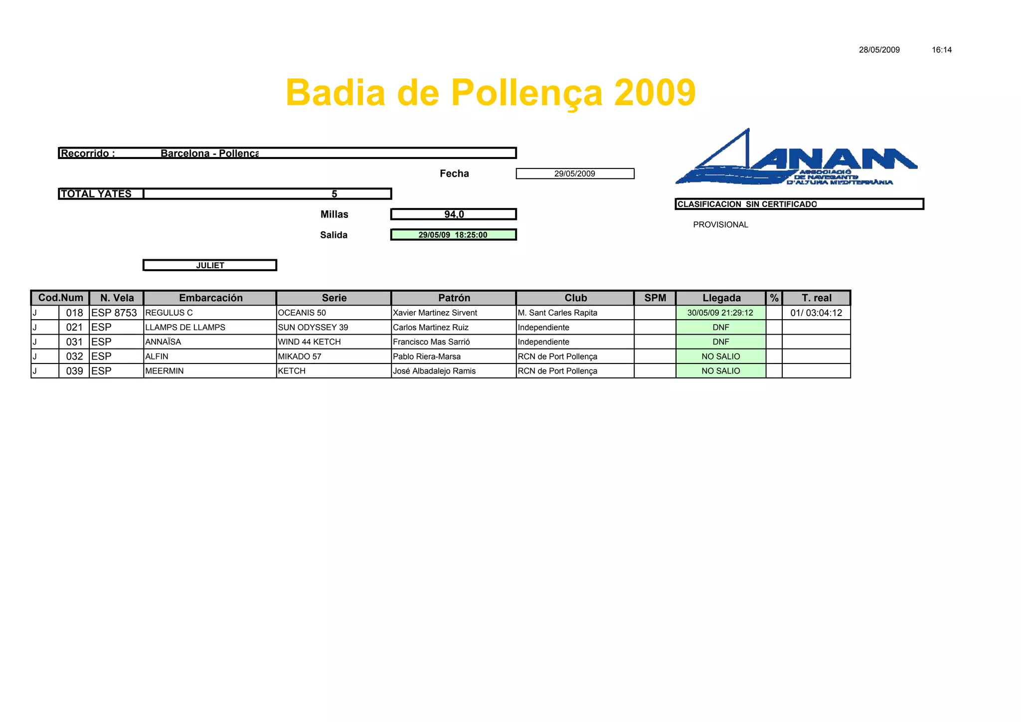 Este documento proporciona un resumen de una regata de vela que se llevará a cabo el 29 de mayo de 2009 entre Barcelona y Pollença. La regata contará con 5 barcos participantes y se espera que la distancia total sea de 94 millas náuticas. La salida está programada para las 18:25 horas.