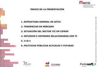 El documento presenta una introducción a la situación del mercado de las TIC en España a través de la Asociación de Empresas de Electrónica, Tecnologías de la Información, Telecomunicaciones y Contenidos Digitales (AETIC). Se describe la estructura de AETIC, las tendencias del mercado TIC en España, la situación del sector en cifras, estudios e informes relacionados, políticas de I+D+i y las políticas públicas actuales y futuras relacionadas con las TIC.