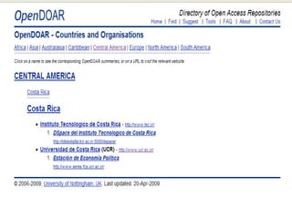 Este documento describe los repositorios institucionales existentes en Costa Rica. Explica que hay algunos intentos en universidades públicas como el ITCR, UCR y UNA, pero que su desarrollo aún es incipiente debido a falta de políticas, prejuicios conceptuales y falta de creatividad. Concluye que es necesario divulgar más sobre los repositorios y aplicar estándares internacionales para que cumplan su propósito de dar acceso abierto al conocimiento generado con fondos públicos.