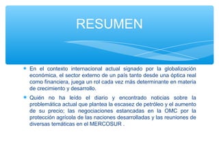 El documento habla sobre la operatoria aduanera en Argentina en el contexto actual de globalización económica. Explica que el sector externo de un país juega un rol determinante en el crecimiento y desarrollo. Luego resume los principales instrumentos y procedimientos aduaneros de Argentina como la Ley de Aduanas, organismos de aplicación como la AFIP, trámites de importación y exportación, y tributos a las importaciones.