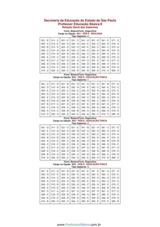 Este documento contiene las respuestas clave (gabaritos) para varios exámenes de selección de profesores de educación básica en las áreas de biología, educación física e historia en el estado de São Paulo, Brasil. Presenta 5 juegos de respuestas clave para cada área, con las respuestas a 80 preguntas de opción múltiple por cada juego.