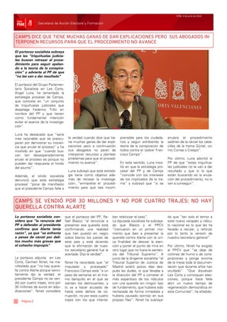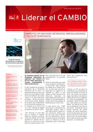 El documento critica la gestión económica de Camps y el PP en la Comunitat Valenciana, acusándolos de paro, retroceso, irregularidades y falta de democracia. Señala que el desempleo ha disminuido menos en la Comunitat que en el resto de España. También critica la estrategia procesal de Camps para retrasar las investigaciones sobre su corrupción y las deudas del gobierno autonómico con las universidades.