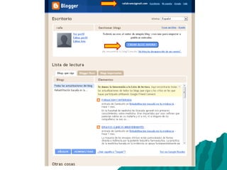El documento habla sobre blogs. Define un blog como una publicación web actualizada periódicamente con artículos escritos de forma personal e informal en orden cronológico inverso sobre un tema específico. Explica que un blog permite contar cosas con diferentes medios como palabras, videos y audio, escapando de los límites del papel. También menciona que un blog puede ser usado como un diario personal, una herramienta periodística o de aprendizaje y ha contribuido a una nueva forma de comunicación y difusión de conocimiento.