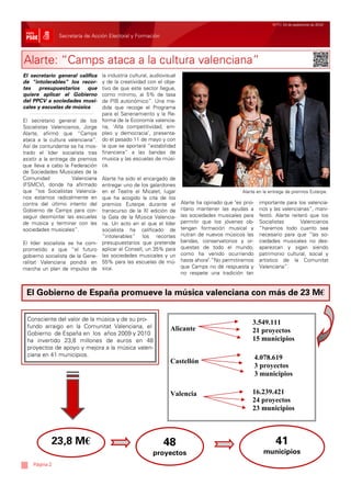 El secretario general de los Socialistas Valencianos, Jorge Alarte, critica los recortes presupuestarios del Gobierno de Camps a las sociedades musicales y escuelas de música, calificándolos de "intolerables". La Comisión Nacional de Garantías Electorales proclama provisionalmente a Alarte como candidato a la presidencia de la Generalitat tras validar 8.507 de sus 9.018 avales. La secretaria general de los Socialistas de Valencia acusa a Camps de mantener un "silencio cómplice" sobre el almacén temporal