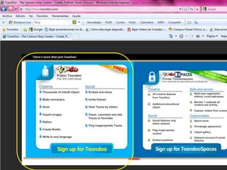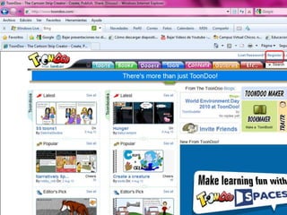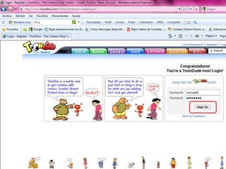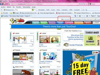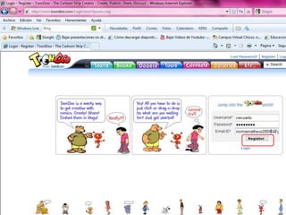 Este documento proporciona instrucciones sobre cómo registrarse y crear un cómic en la plataforma Toondoo.com. Explica que los usuarios deben ingresar un nombre de usuario y contraseña para iniciar sesión, y luego tendrán acceso a herramientas como personajes, fondos y textos para crear viñetas. También menciona que Toondoo ofrece una galería y la opción de compartir los cómics creados en un blog.