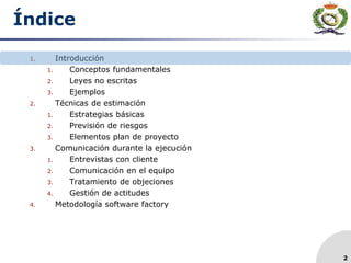 El documento aborda la dirección y gestión de proyectos web en el ámbito de la ingeniería informática, presentando conceptos fundamentales, técnicas de estimación, comunicación durante la ejecución y una metodología específica. Se destacan la importancia de la planificación y la gestión de expectativas del cliente, así como la previsión de riesgos y la comunicación efectiva entre el equipo y los clientes. Se incluyen también principios y ejemplos que fundamentan las áreas de enfoque del curso para el año académico 2010-2011.