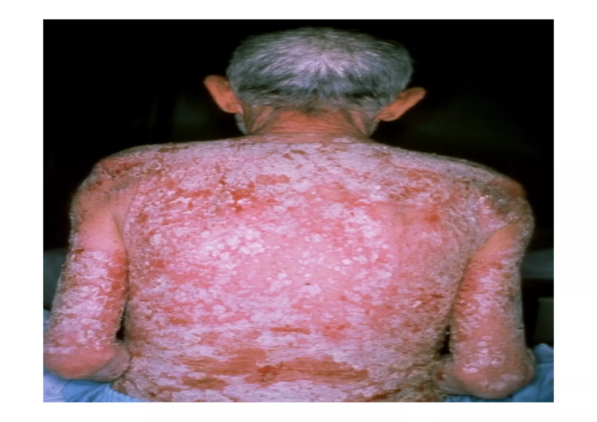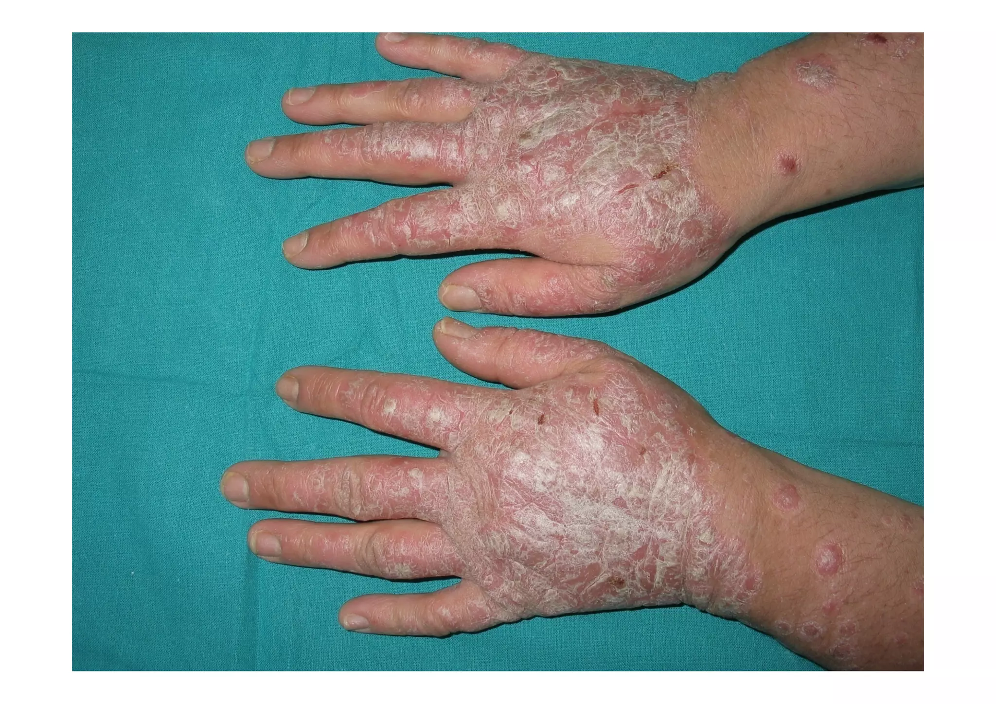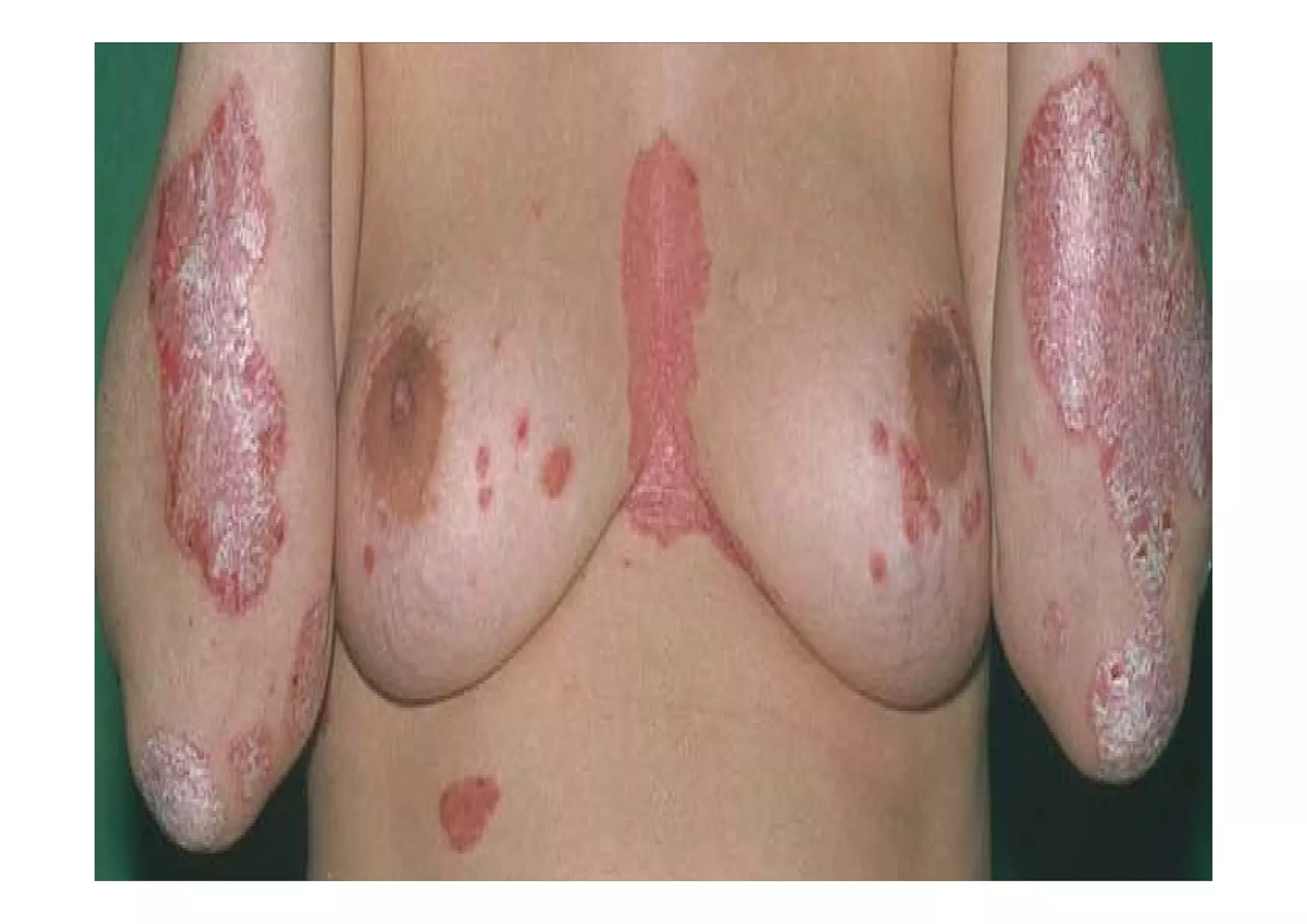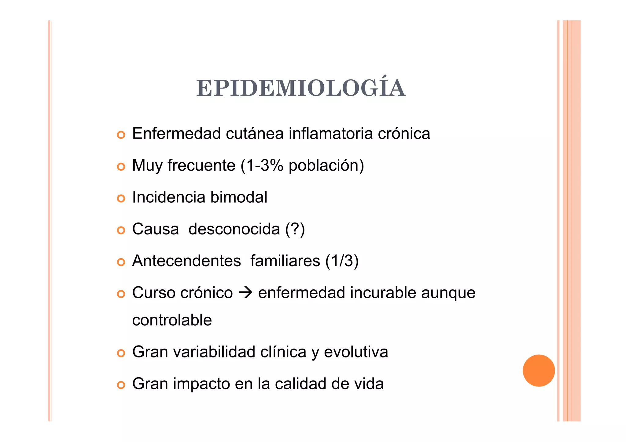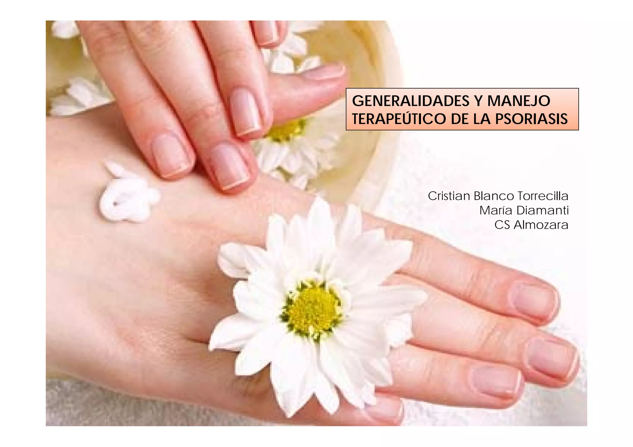 Este documento resume la epidemiología, etiología, patogenia, manifestaciones clínicas, diagnóstico y tratamiento de la psoriasis. La psoriasis es una enfermedad cutánea inflamatoria crónica de causa desconocida que afecta al 1-3% de la población. Se caracteriza por placas eritematosas descamativas que pueden afectar a la piel y uñas. Su tratamiento incluye medidas tópicas, fototerapia, fármacos sistémicos como retinoides y ter