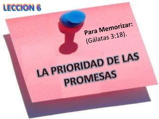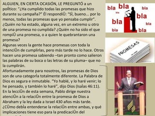 El documento habla sobre las promesas de Dios y cómo son diferentes a las promesas humanas. Explica que la promesa que Dios le hizo a Abraham no fue anulada cuando más tarde Dios dio la ley a Israel, ya que una promesa de Dios no puede ser quebrantada. También discute la relación entre la fe, la gracia y la ley, señalando que la ley revela el pecado pero no justifica, y que la fe en Cristo es lo que salva.