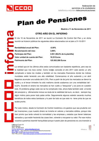 La rentabilidad anual del plan de pensiones fue de -5.59% y la revalorización del mes fue de 3.99%. El valor de la unidad de cuenta es de 18.35 euros y el patrimonio total es de 125.56 millones de euros. El año 2011 ha sido complicado para los mercados financieros debido a la volatilidad causada por la crisis griega y la deuda italiana, aunque la gestora ha diversificado las inversiones para reducir riesgos. La comisión de control insta a la gestora a invertir de manera prudente y responsable a largo pl