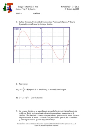 Este documento presenta un examen de matemáticas de 3er año de secundaria en España. Consiste en 6 preguntas que cubren temas como funciones, sistemas de ecuaciones, representación gráfica, y factorización de polinomios. Los estudiantes con dos o más evaluaciones suspendidas solo deben completar las preguntas 1, 2 y 4.