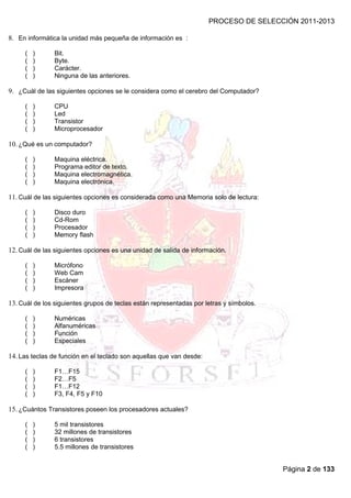 Este documento presenta un banco de preguntas de computación con respuestas múltiples para un proceso de selección entre 2011-2013. Contiene 63 preguntas sobre temas de hardware, software, sistemas operativos, componentes de computadoras, Windows y Office. Las preguntas buscan evaluar conocimientos básicos de informática.