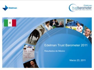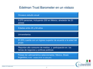 El estudio Edelman Trust Barometer 2011 encontró que la confianza en las instituciones está creciendo globalmente. En México, las personas confían más en las ONG y las empresas, pero confían menos en el gobierno en comparación con los niveles globales y latinoamericanos. Además, la confianza en las empresas se mantuvo muy alta en México entre 2010-2011, mientras que la confianza en el gobierno tiende a disminuir en la mayoría de los países.