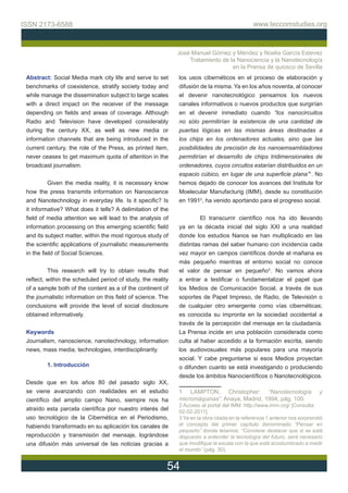 Este documento resume el estudio realizado sobre el tratamiento de la nanociencia y la nanotecnología en la prensa de quiosco de Sevilla. El estudio analizó 3 periódicos (ABC, Diario de Sevilla y El Correo de Andalucía) durante una semana en enero de 2011. Los resultados mostraron que había una media de 2,86 noticias diarias sobre ciencia y tecnología pero solo 0,14 noticias diarias sobre nanociencia y nanotecnología, indicando una escasa cobertura de estos temas.