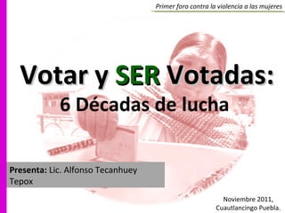 El primer foro contra la violencia a las mujeres busca evaluar la participación política de las mujeres en México a lo largo de la historia, destacando logros como el derecho al voto y ocupación de cargos electos. A pesar de los avances, se enfrenta a un contexto de discriminación y se subraya la necesidad de sensibilización y capacitación en los partidos políticos. Se concluye que la inclusión y verdadero apoyo a las mujeres en la política requiere un cambio de mentalidad y esfuerzos a todos los niveles.