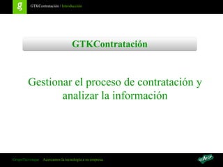 El documento describe el funcionamiento de 'gtkcontratación', una herramienta destinada a gestionar el proceso de contratación y análisis de información. Su objetivo incluye facilitar la selección de concursos, controlar el estado de adjudicación y gestionar líneas de aval. Además, se detalla la importación periódica de datos, los perfiles de acceso y opciones de licenciamiento para su instalación en servidores o en la nube.